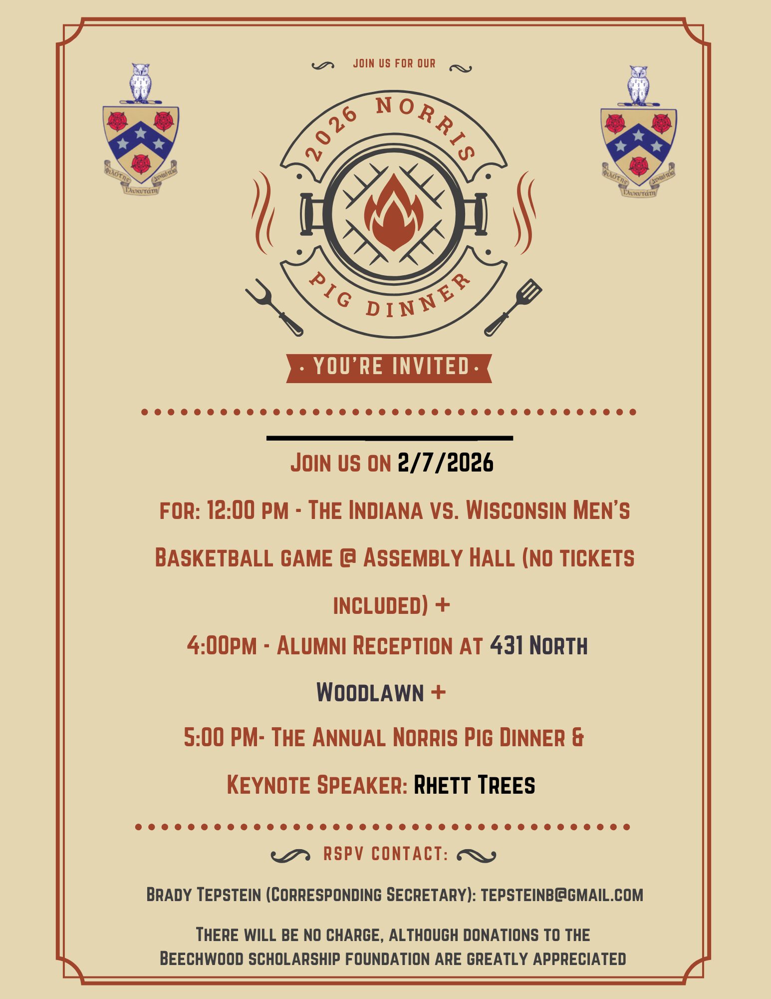We invite you to join us for the 2026 Norris Pig Dinner (see attached invitation) on February 7th as we celebrate 155 consecutive years on the campus of Indiana University.